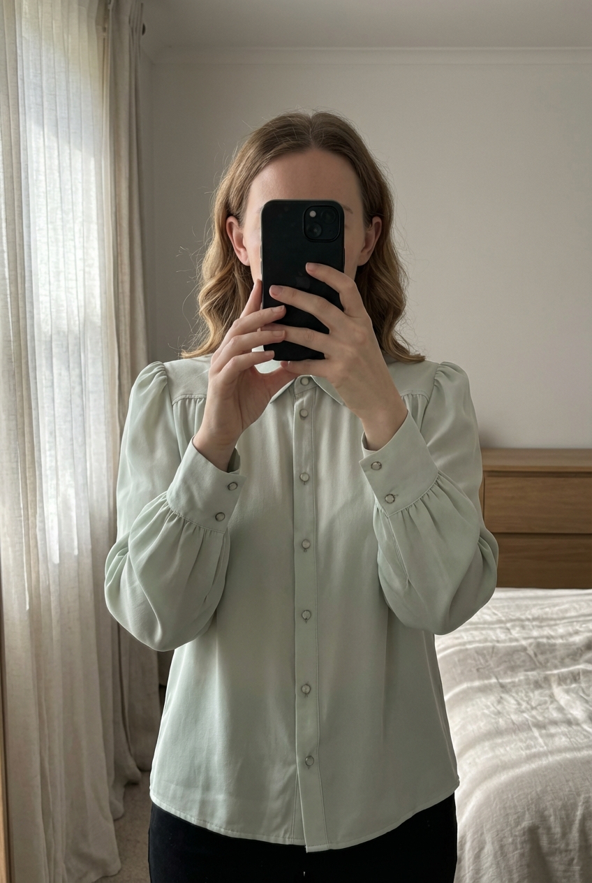 Une personne en Chemise manches longues Taille M debout, face à la caméra, dans une chambre à la lumière douce, avec une lumière naturelle filtrant par la fenêtre.