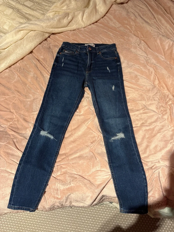 Vestido denim zara de pie, mirando a la cámara, en un dormitorio con luz suave y natural filtrándose por la ventana.