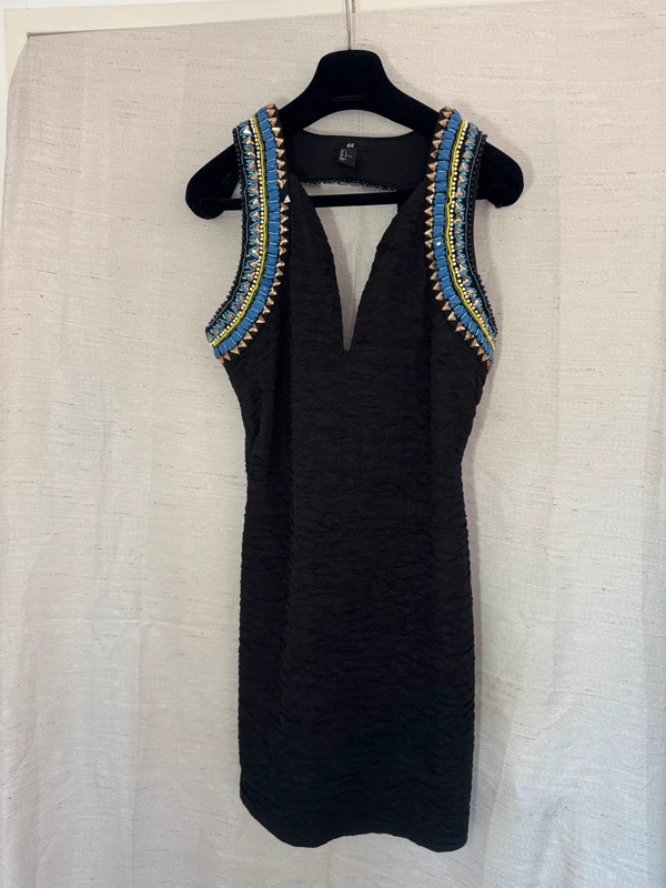 Vestido corto kilibbi talla L de pie, mirando a la cámara, en un dormitorio con luz suave y natural filtrándose por la ventana.