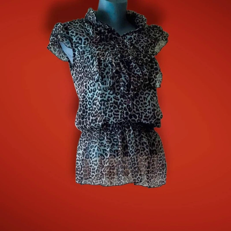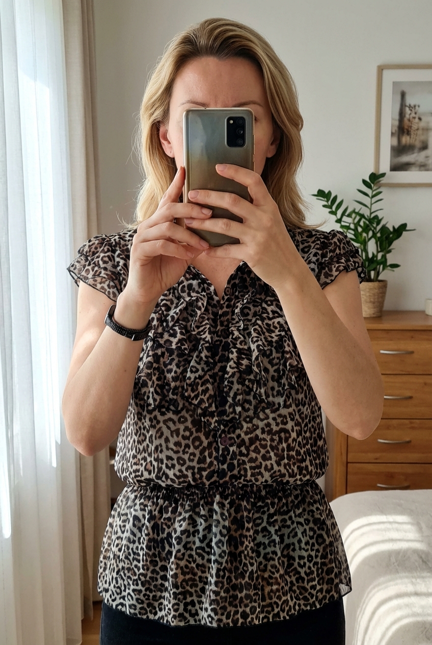 Blusa Hobbs London estampado leopardo talla uk10 es38 de pie, mirando a la cámara, en un dormitorio con luz suave y natural filtrándose por la ventana.
