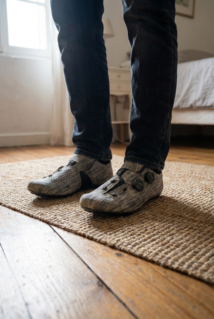 Maillot de cyclisme / XXXL debout, face à la caméra, dans une chambre à la lumière douce, avec une lumière naturelle filtrant par la fenêtre.