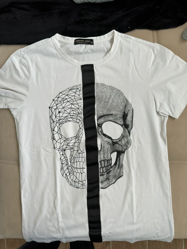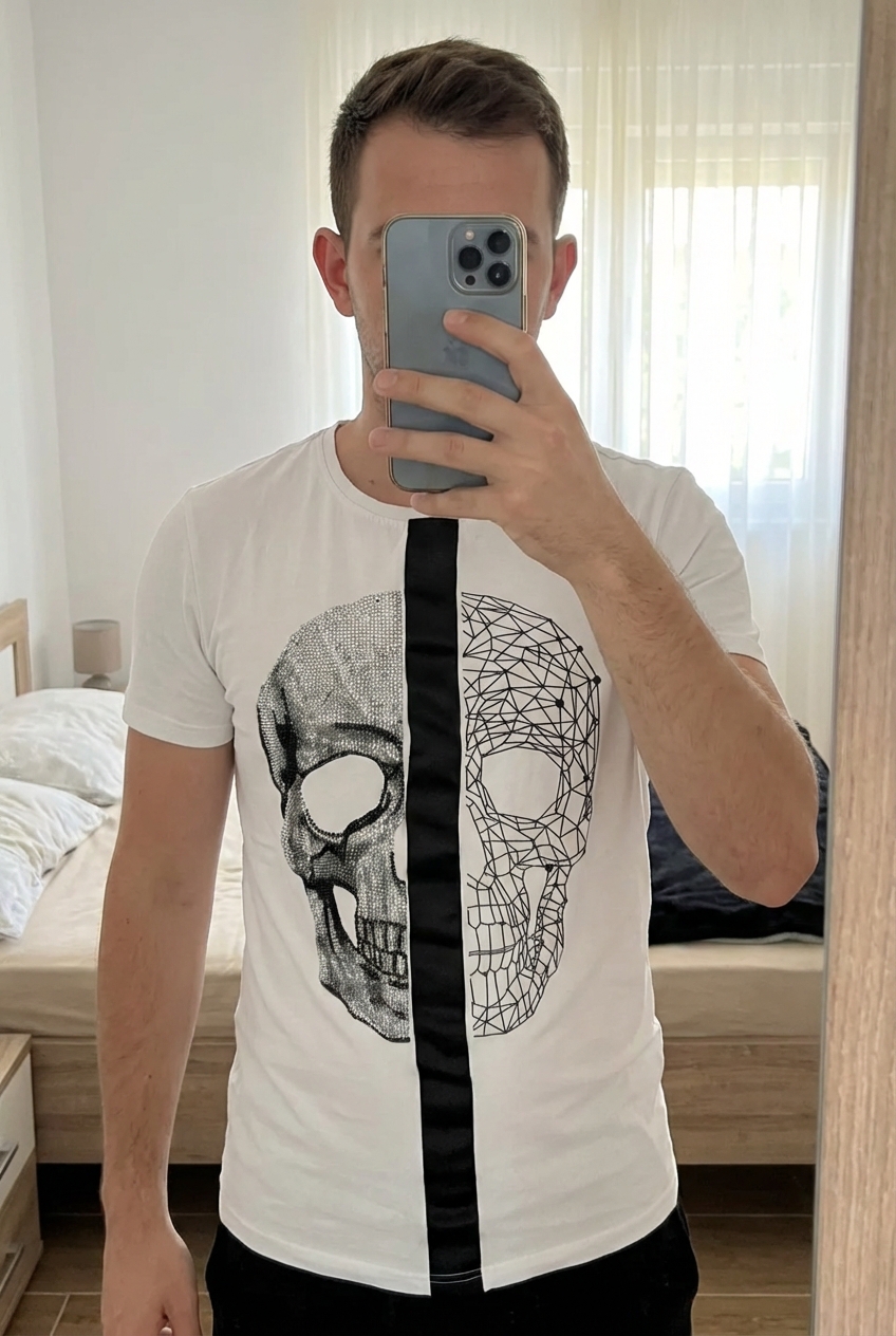 Camiseta manga corta tul print de Bershka de pie, mirando a la cámara, en un dormitorio con luz suave y natural filtrándose por la ventana.