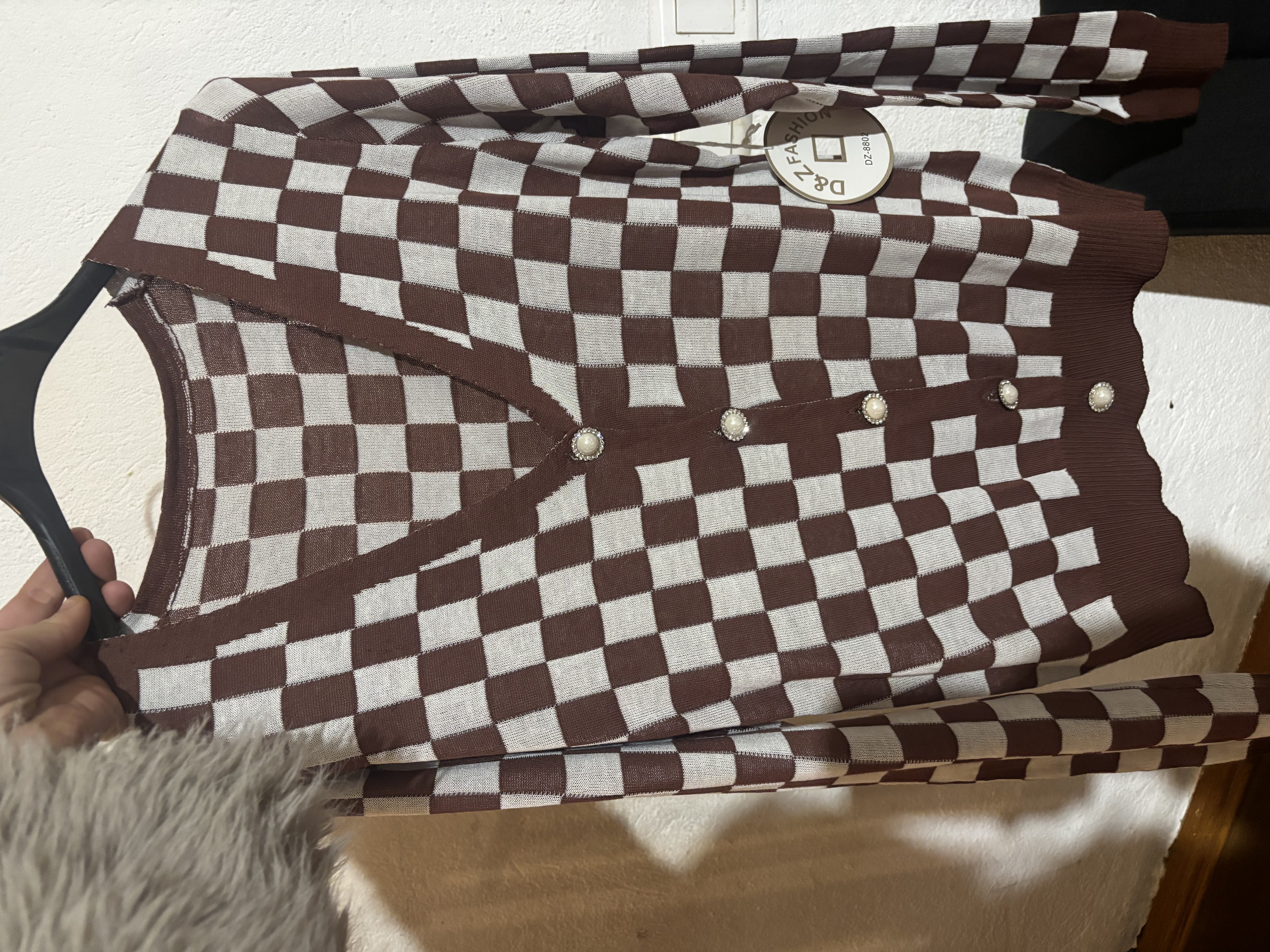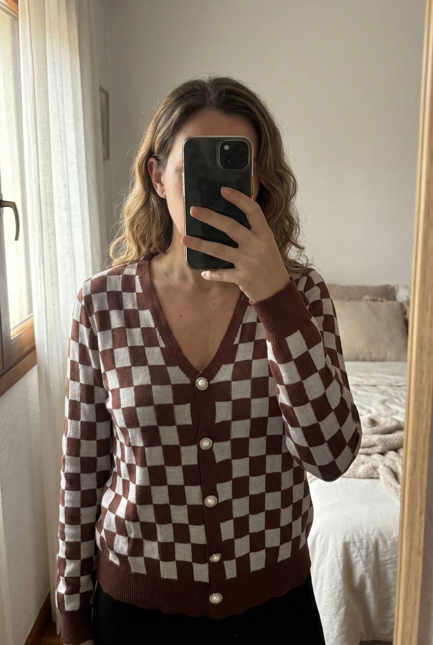 Cárdigan Punto Zara M de pie, mirando a la cámara, en un dormitorio con luz suave y natural filtrándose por la ventana.