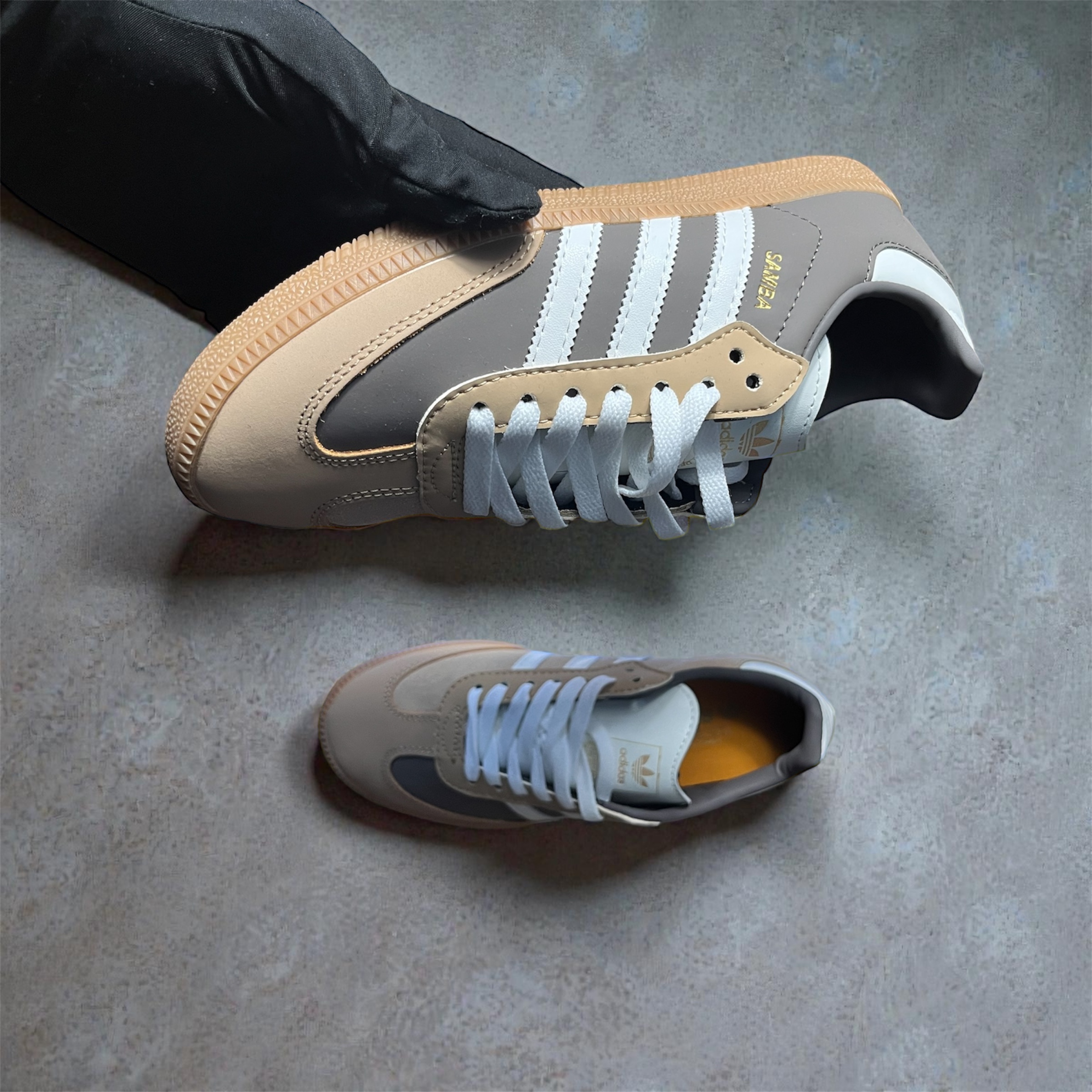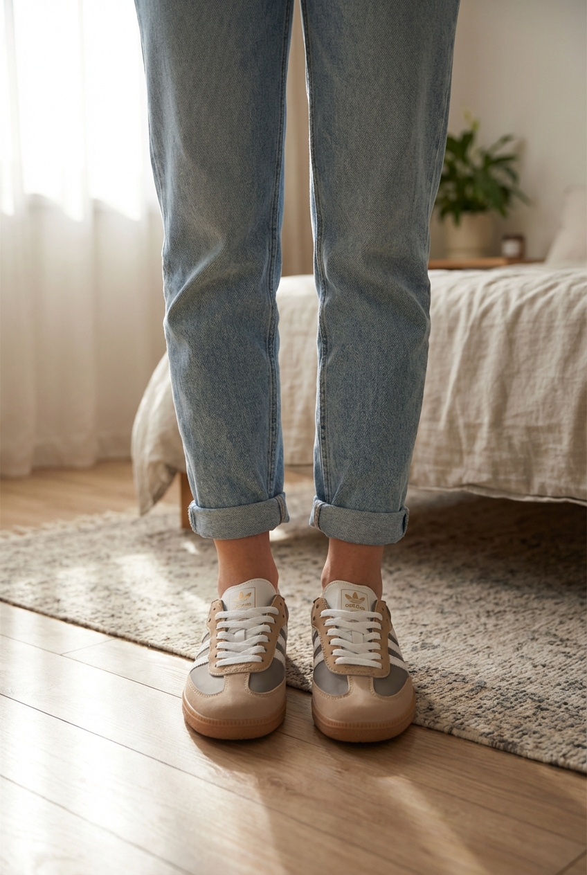 Baskets léopard Adidas neuves jamais portées debout, face à la caméra, dans une chambre à la lumière douce, avec une lumière naturelle filtrant par la fenêtre.