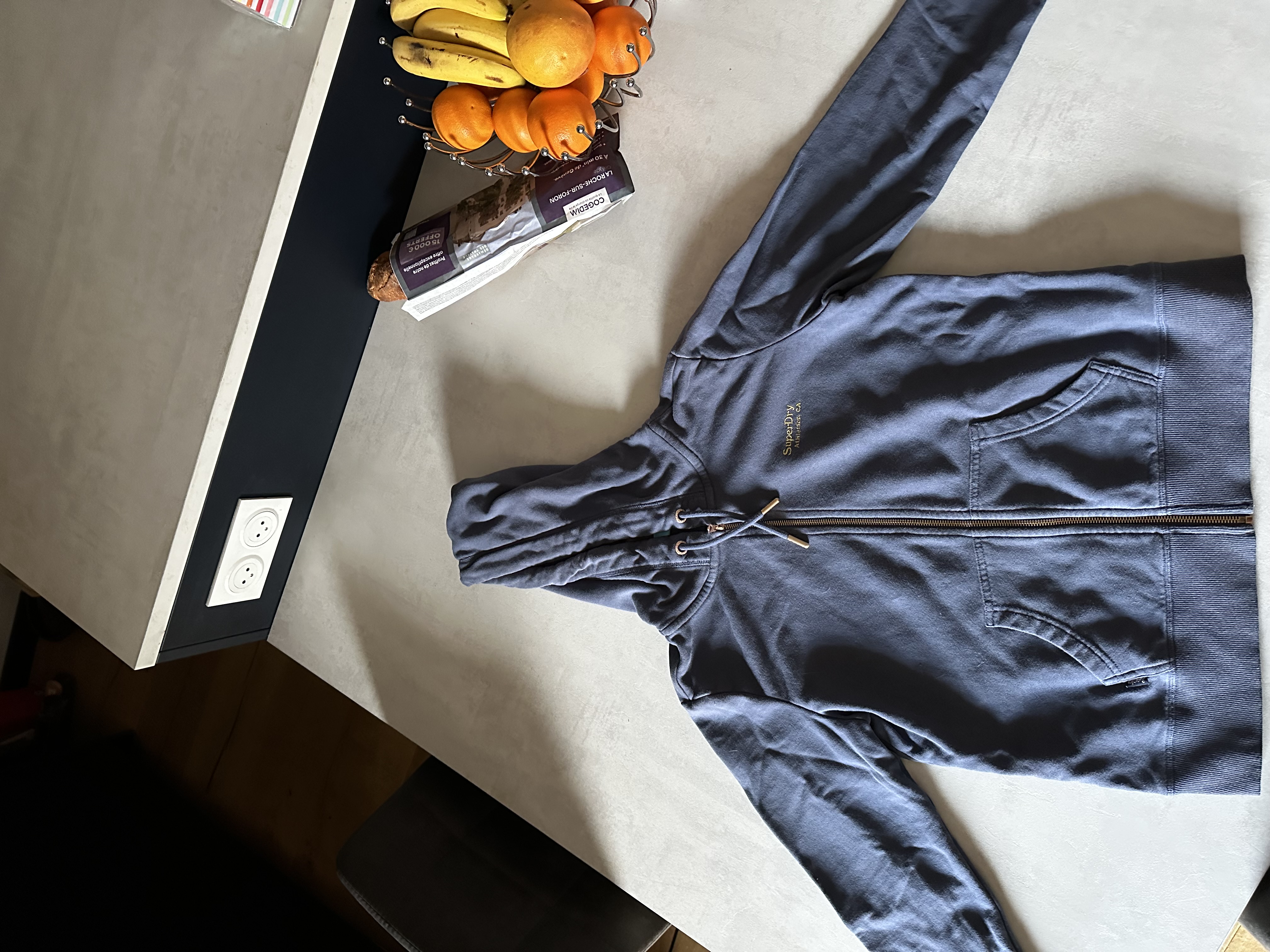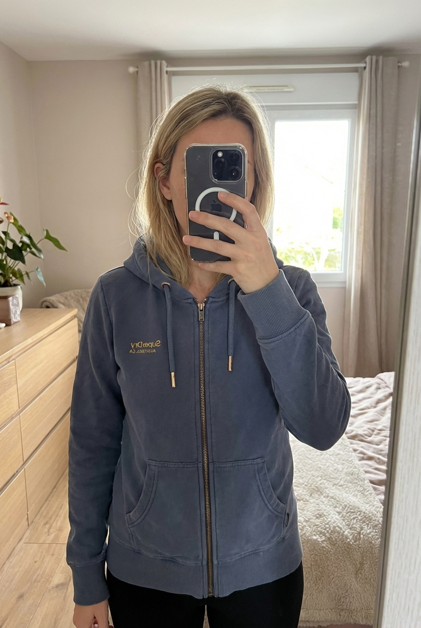 Doudoune sinéquanone neuve debout, face à la caméra, dans une chambre à la lumière douce, avec une lumière naturelle filtrant par la fenêtre.