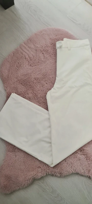 Pantalon simili cuir creme debout, face à la caméra, dans une chambre à la lumière douce, avec une lumière naturelle filtrant par la fenêtre.