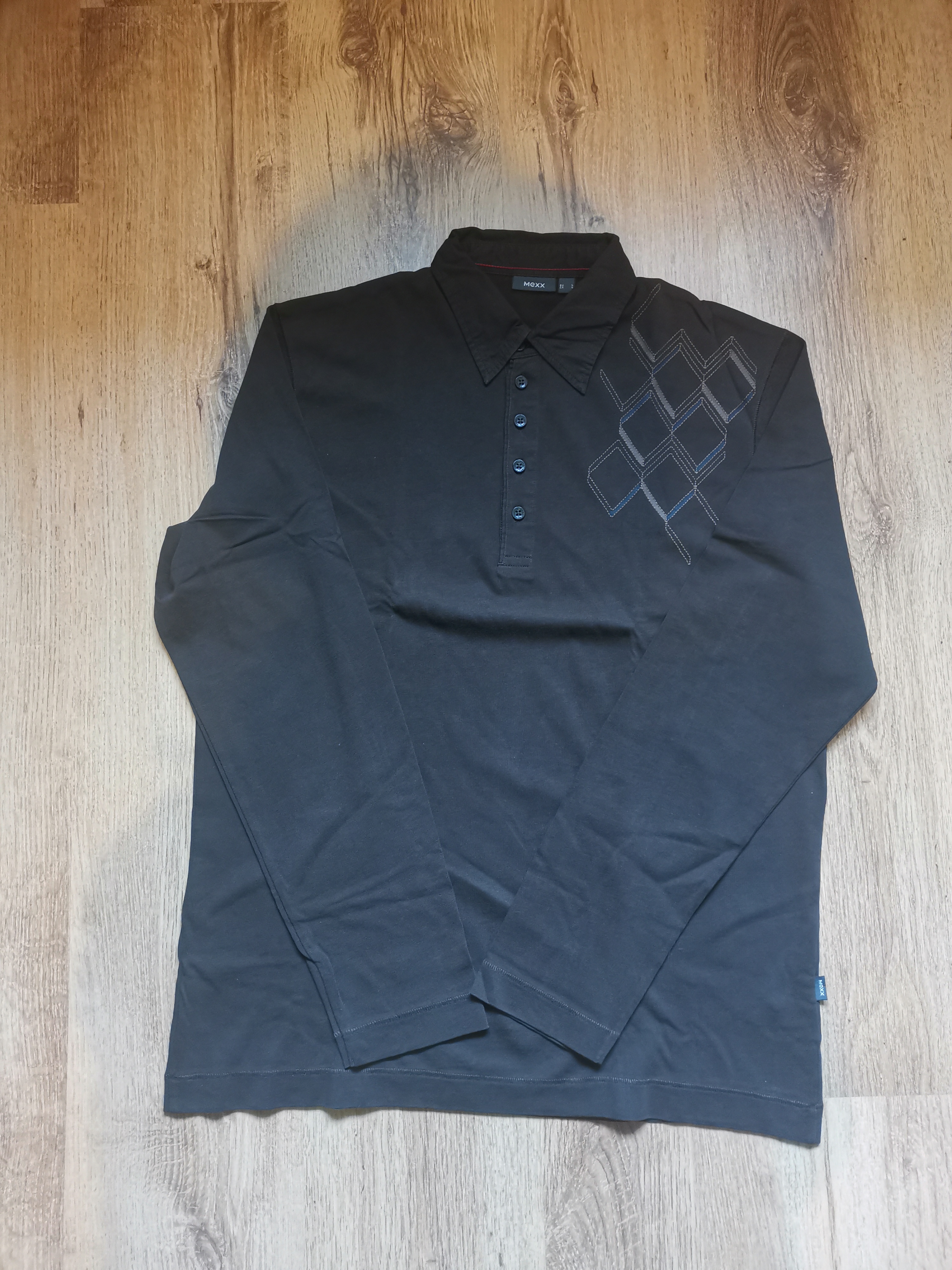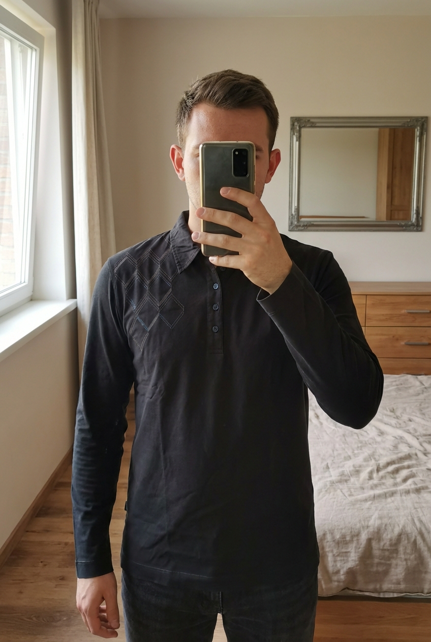 American Eagle Jersey Hombre – Talla M – Color Azul de pie, mirando a la cámara, en un dormitorio con luz suave y natural filtrándose por la ventana.