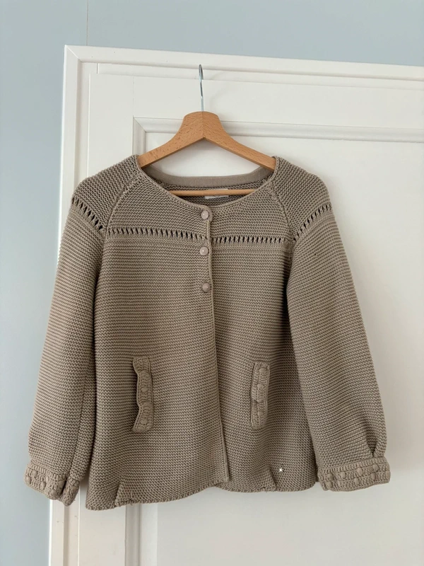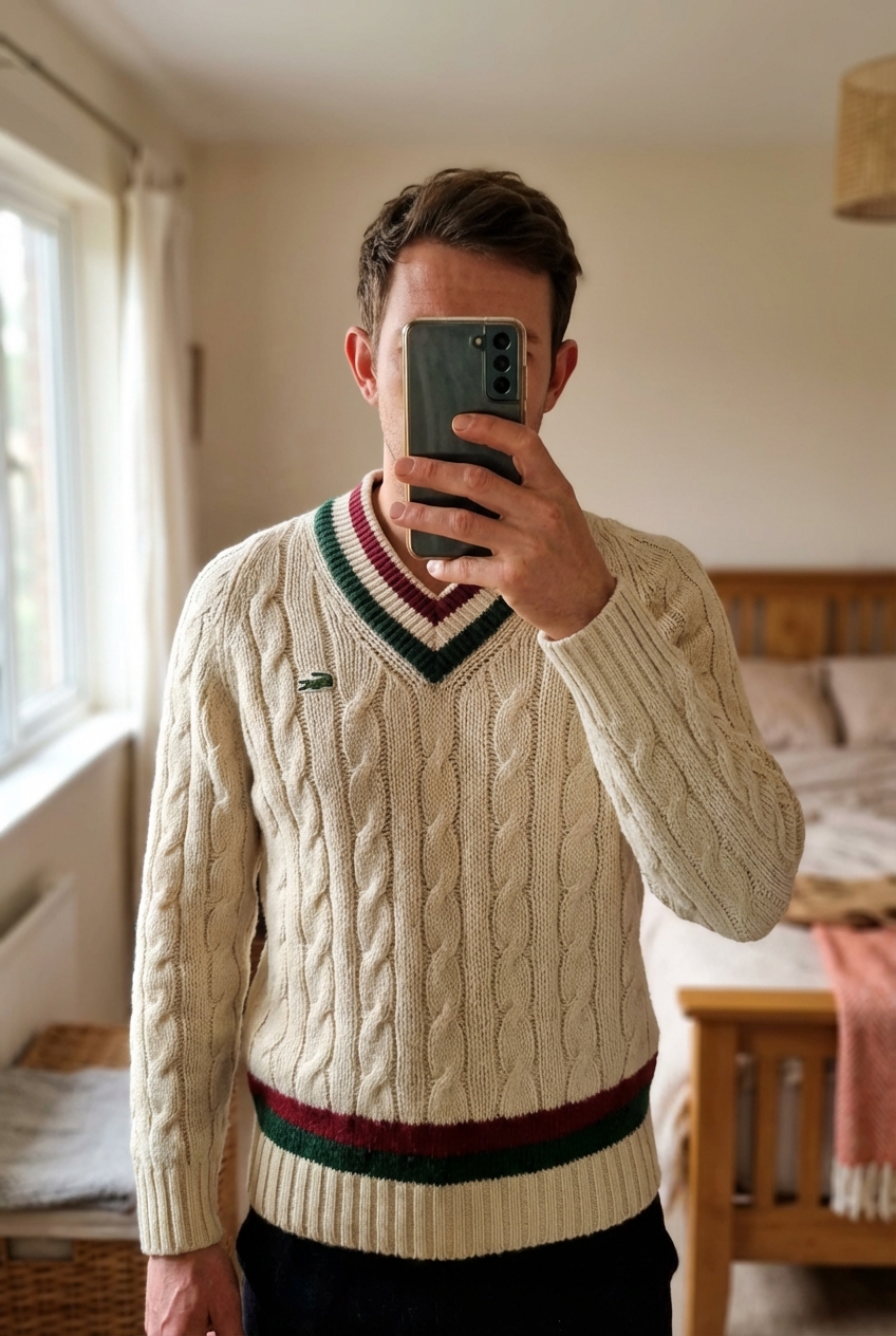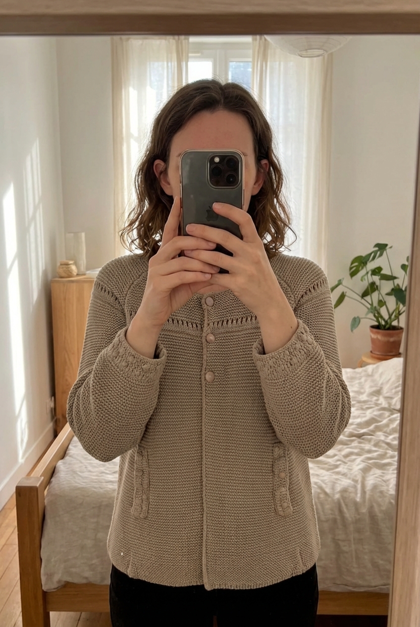 Cardigan chic et choc debout, face à la caméra, dans une chambre à la lumière douce, avec une lumière naturelle filtrant par la fenêtre.