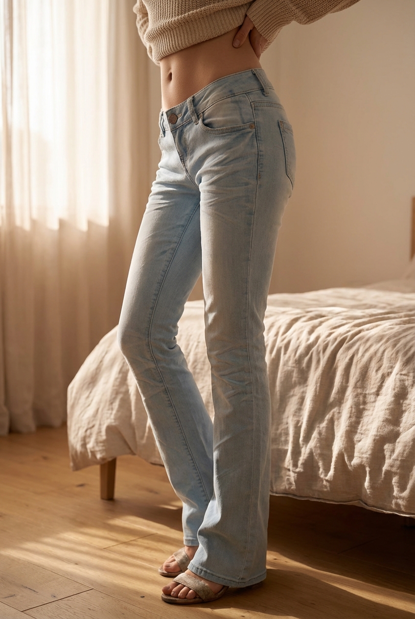 Una persona con Peto vaquero arqueando ligeramente la espalda para una pose dinámica, con tipo de cuerpo delgado, en un dormitorio con luz suave y natural filtrándose por la ventana.