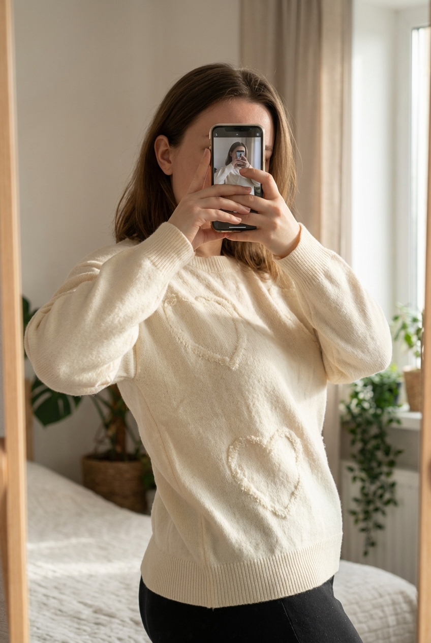 Jersey de Bershka de pie, mirando a la cámara, en un dormitorio con luz suave y natural filtrándose por la ventana.