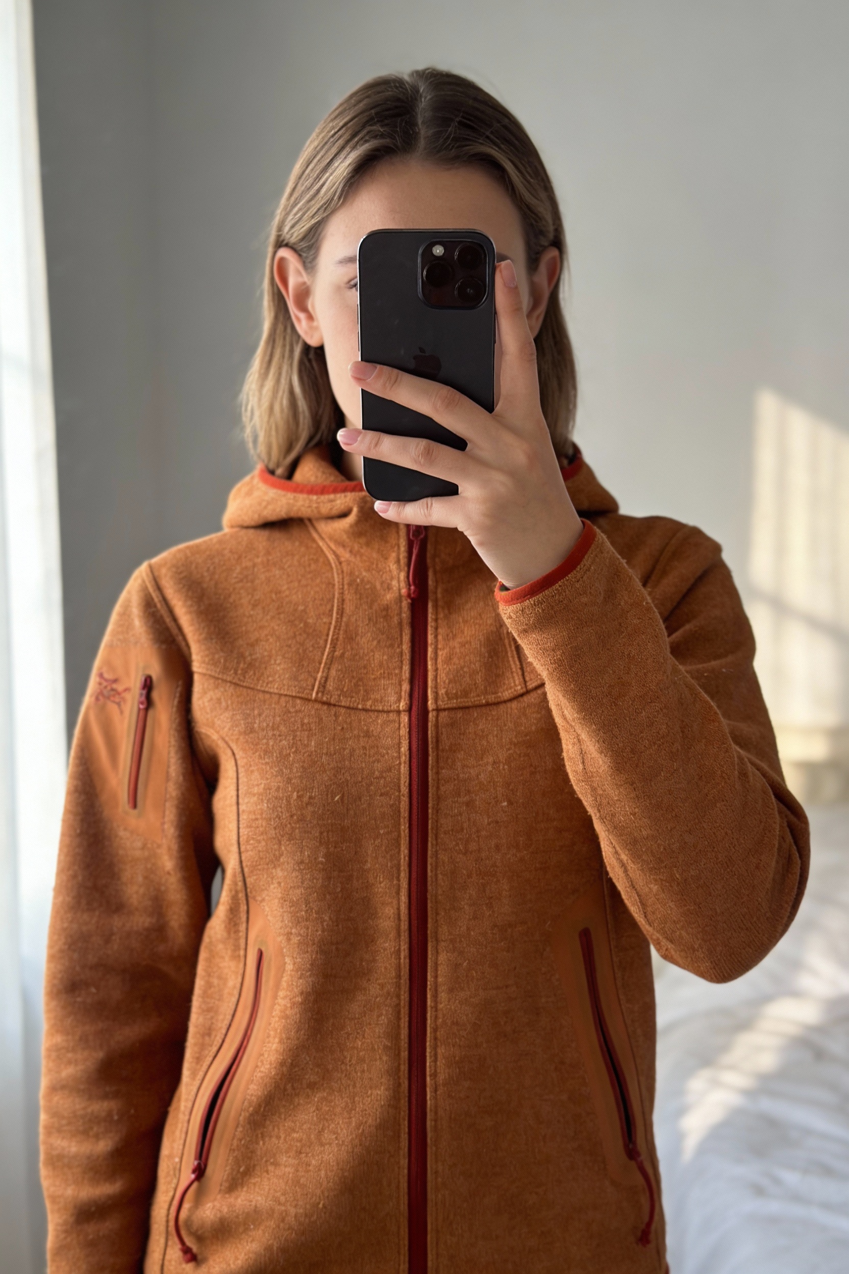 Veste d'hivers debout, face à la caméra, dans une chambre à la lumière douce, avec une lumière naturelle filtrant par la fenêtre.