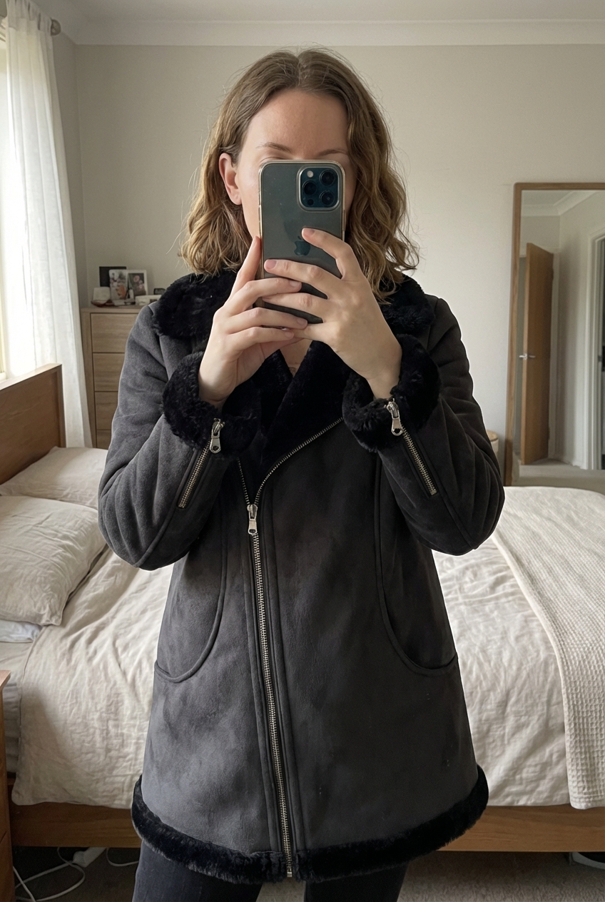 Cazadora efecto pelo de Stradivarius de pie, mirando a la cámara, en un dormitorio con luz suave y natural filtrándose por la ventana.