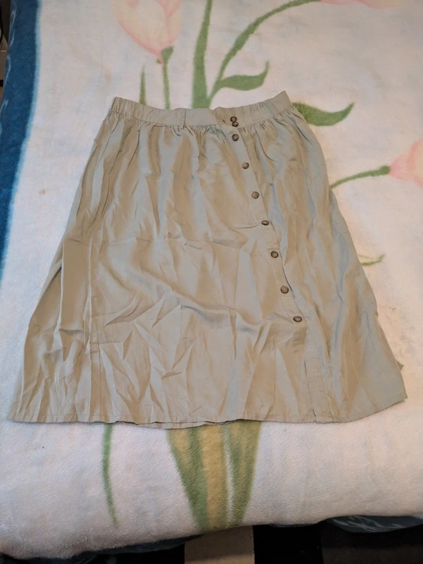 Jupe longue plissée debout, face à la caméra, dans une chambre à la lumière douce, avec une lumière naturelle filtrant par la fenêtre.