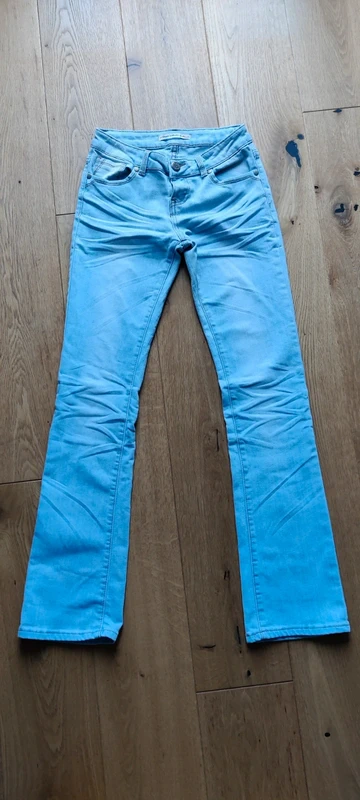 Camisa blusa Vaquera Denim Azul El Ganso Talla M de pie, mirando a la cámara, en un dormitorio con luz suave y natural filtrándose por la ventana.