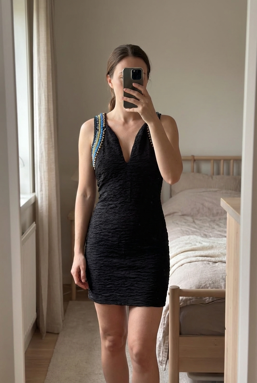 Vestido lentejuelas zara de pie, mirando a la cámara, en un dormitorio con luz suave y natural filtrándose por la ventana.