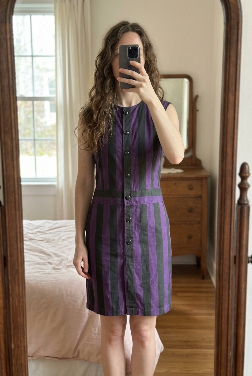 Jolie tunique robe légère taille 44 debout, face à la caméra, dans une chambre à la lumière douce, avec une lumière naturelle filtrant par la fenêtre.