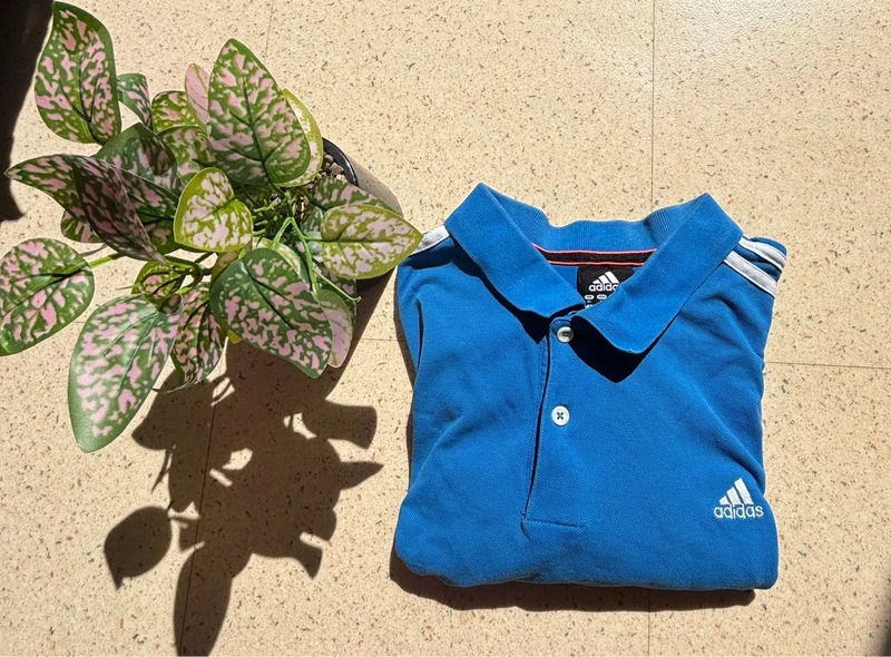 Pantalón de chandal Adidas de pie, mirando a la cámara, en un dormitorio con luz suave y natural filtrándose por la ventana.