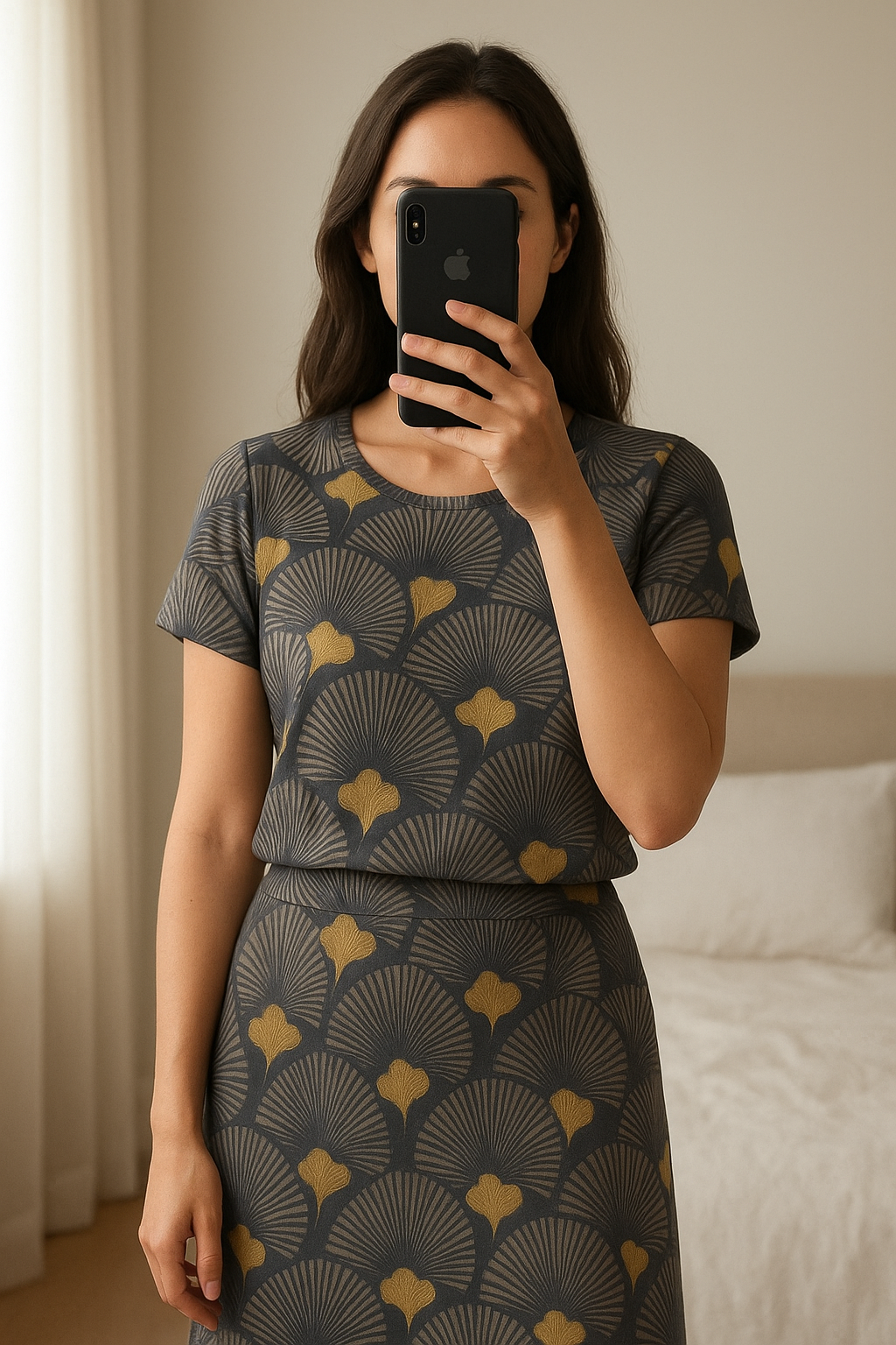 2 Housse de coussin – Motif graphique debout, face à la caméra, dans une chambre à la lumière douce, avec une lumière naturelle filtrant par la fenêtre.