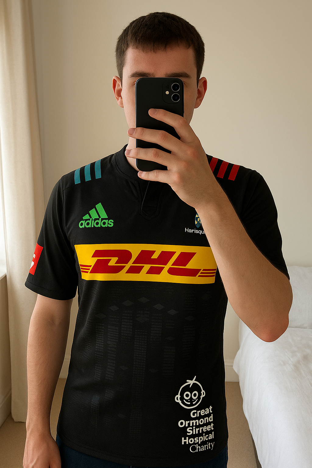 2015 2016 Harlequins Big Game 8 Rugby Union Shirt Medium Exc Condition - Perfect Xmas Gift standing straight facing the camera, in a softly lit bedroom setting, with gentle natural light filtering through a window.