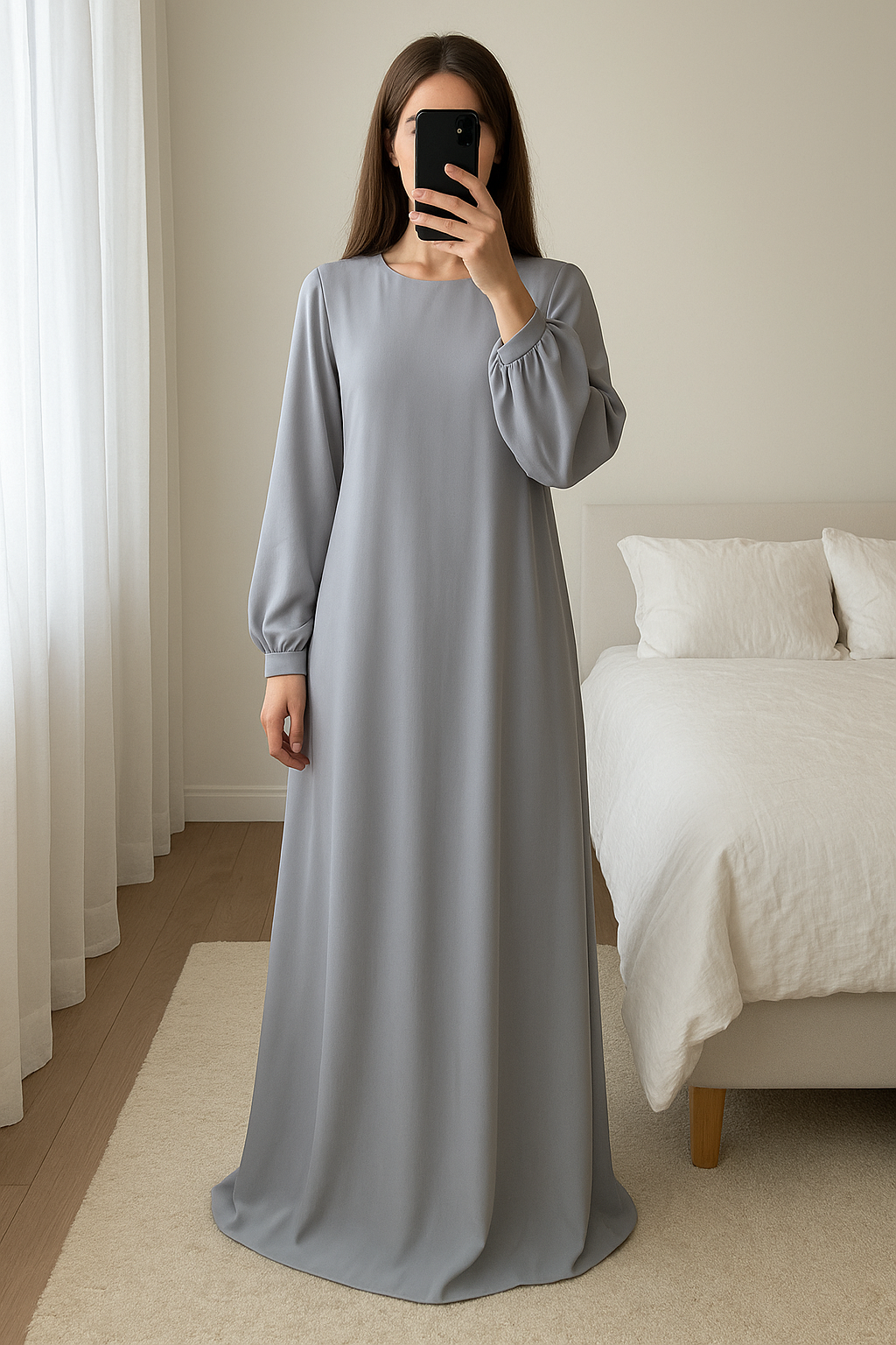 abaya debout, face à la caméra, dans une chambre à la lumière douce, avec une lumière naturelle filtrant par la fenêtre.