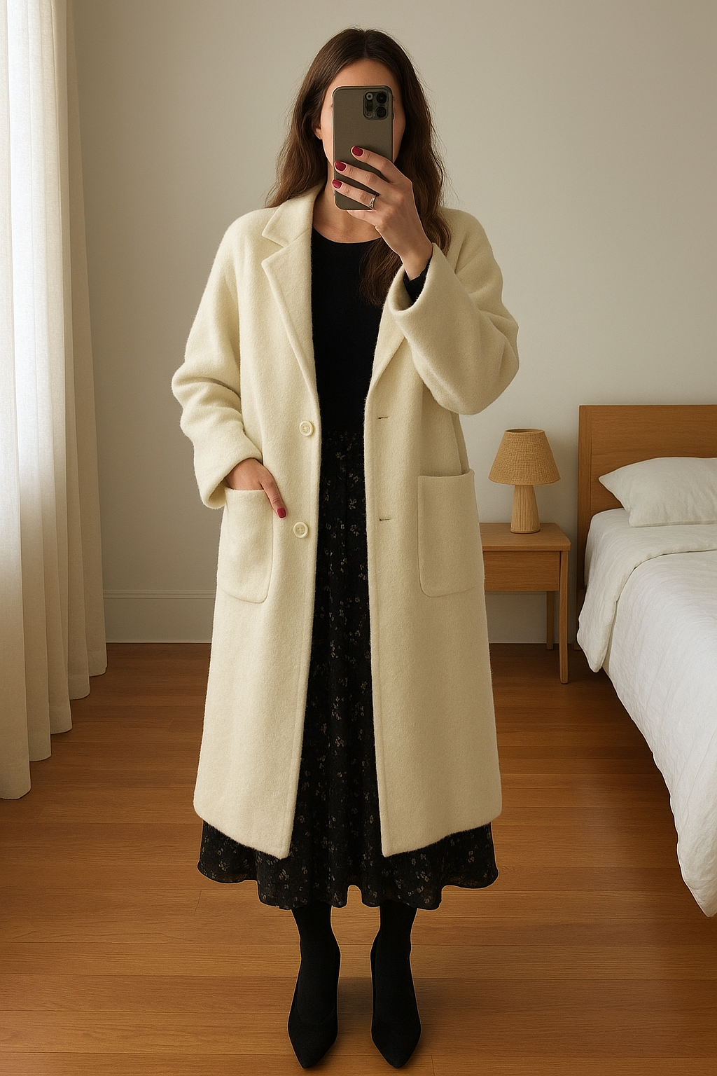 abrigo largo de lana piel sintetica 38 de pie, mirando a la cámara, en un dormitorio con luz suave y natural filtrándose por la ventana.