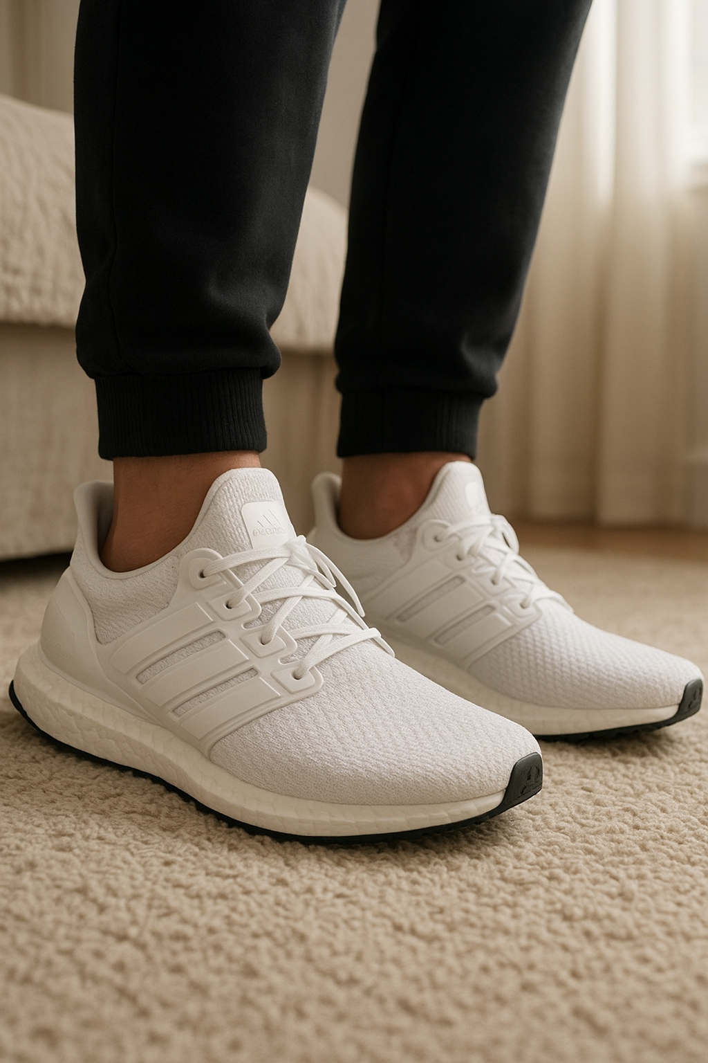 Adidas Utlrabloost 20 debout, face à la caméra, dans une chambre à la lumière douce, avec une lumière naturelle filtrant par la fenêtre.