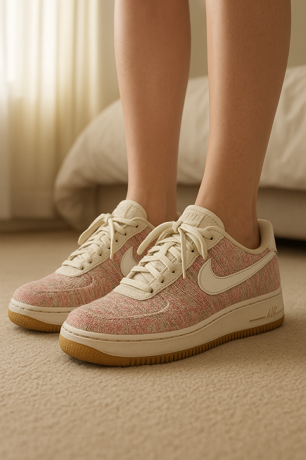 Air Force 1 – Rose & Tissées – Taille 40 – Bon état debout, face à la caméra, dans une chambre à la lumière douce, avec une lumière naturelle filtrant par la fenêtre.