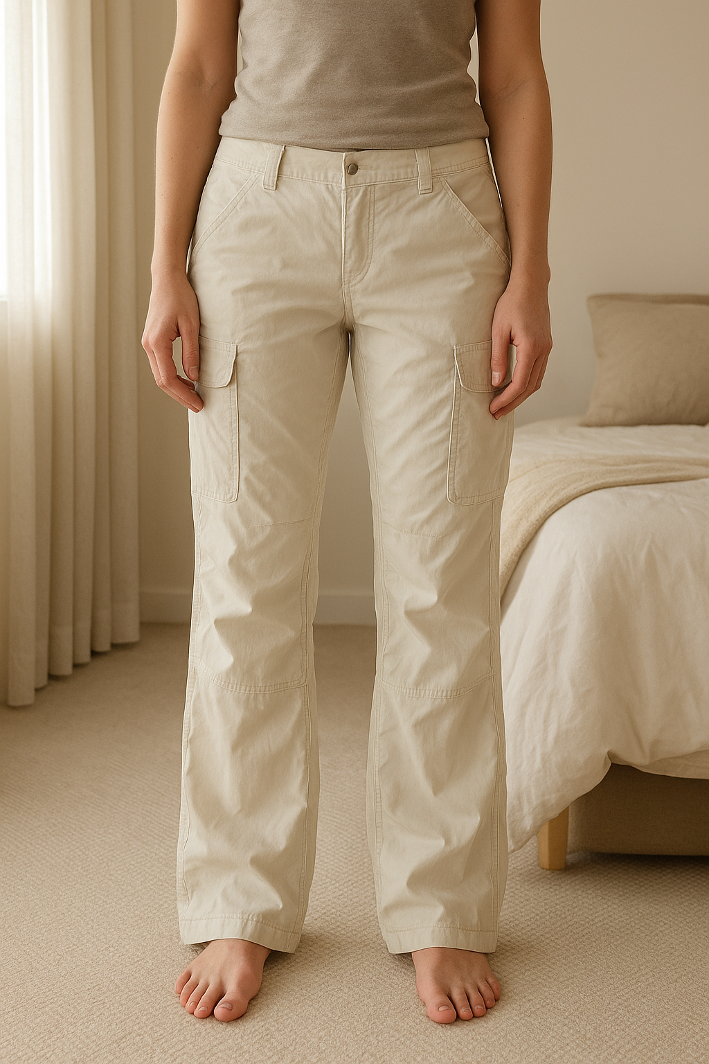 Bílé dámské kalhoty Alpine Pro – vel. M standing straight facing the camera, in a softly lit bedroom setting, with gentle natural light filtering through a window.