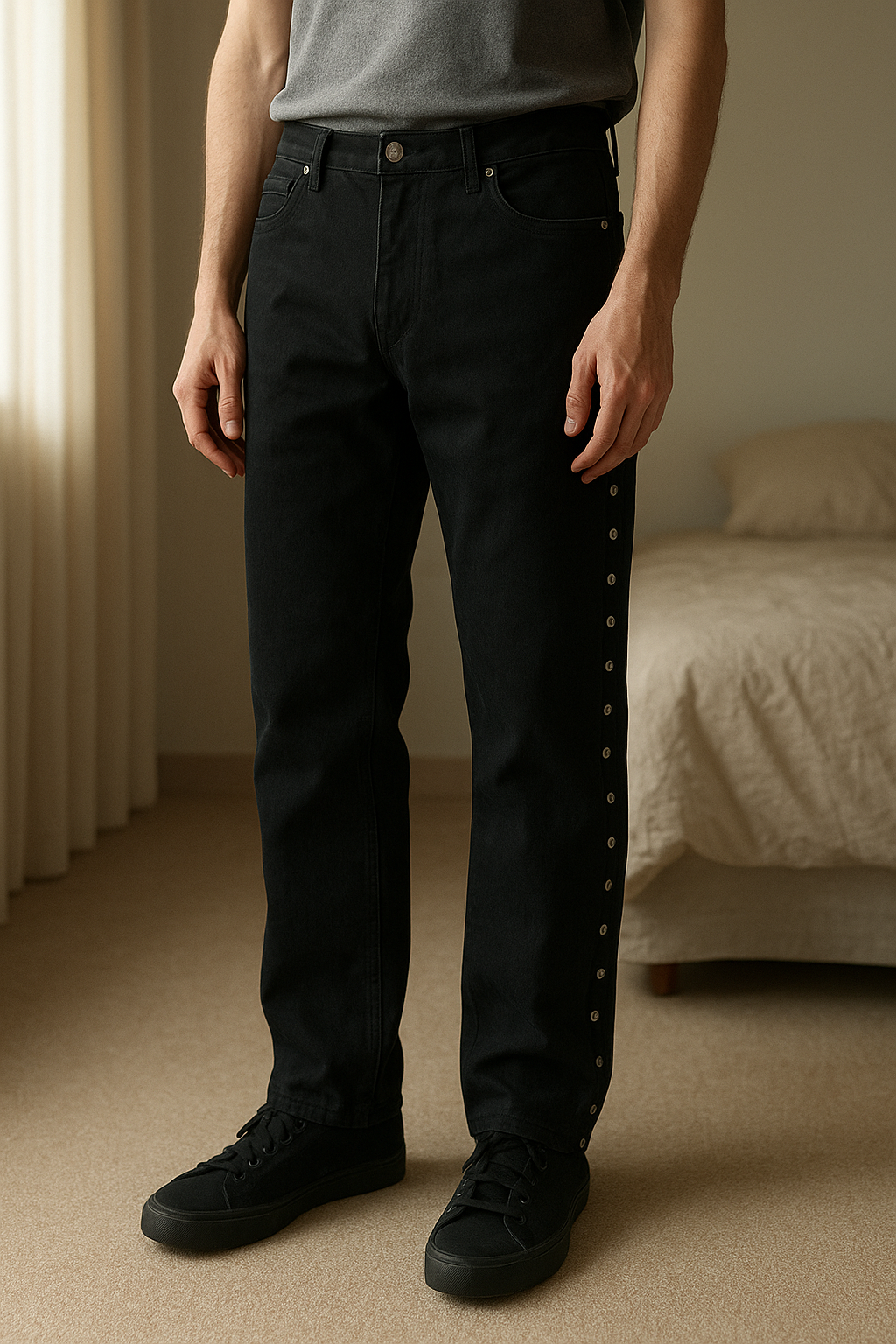 Baggy jeans zara in piedi, rivolto verso la fotocamera, in una camera da letto con luce soffusa e luce naturale che filtra dalla finestra.