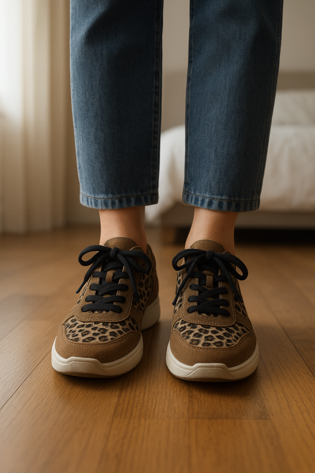 Baskets léopard Sézane debout, face à la caméra, dans une chambre à la lumière douce, avec une lumière naturelle filtrant par la fenêtre.