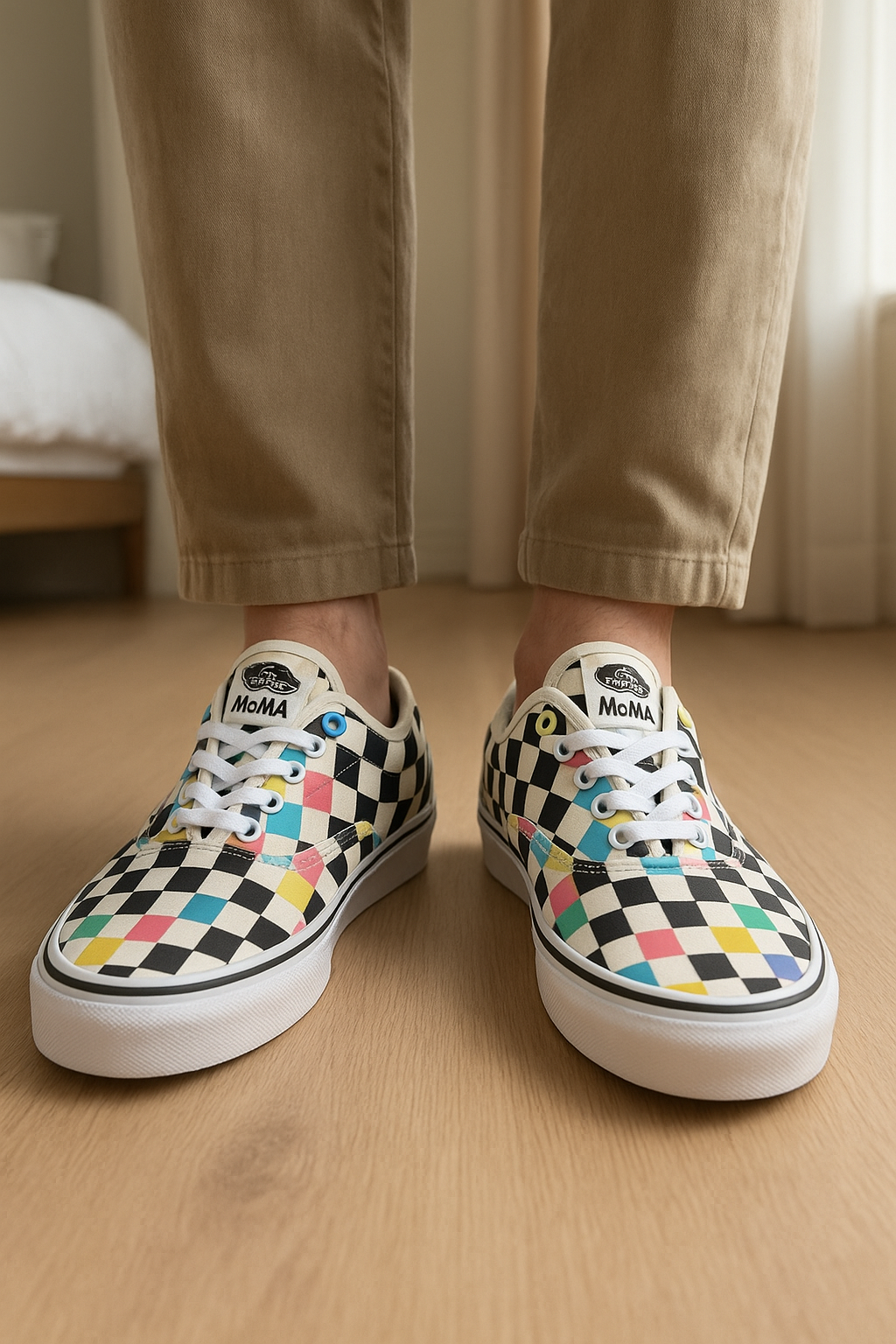 Baskets Vans modèle Moma, taille 37, neuves debout, face à la caméra, dans une chambre à la lumière douce, avec une lumière naturelle filtrant par la fenêtre.