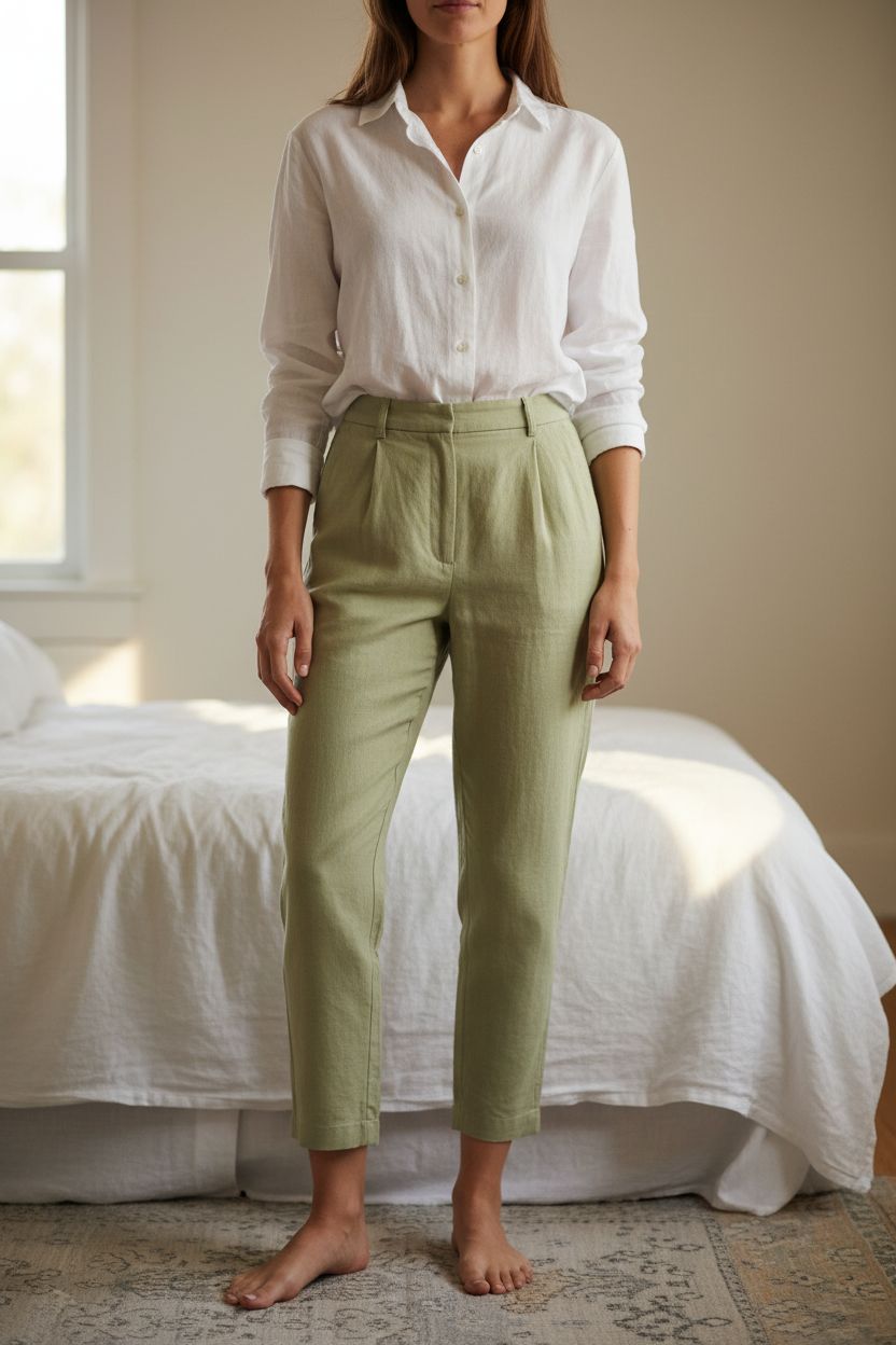 Basler leichte Sommerhose grün Gr. 42 (XL) leicht und elegant aufrecht stehend, der Kamera zugewandt, in einem sanft beleuchteten Schlafzimmer, mit natürlichem Licht, das durch ein Fenster fällt.