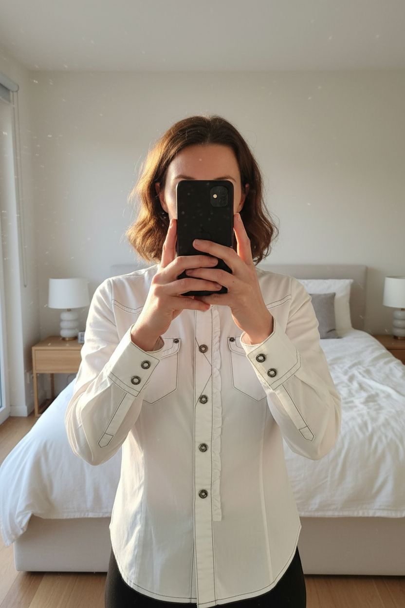 Basler Weekend Bluse weiss Ziernähte Rüschen Gr 40 neu aufrecht stehend, der Kamera zugewandt, in einem sanft beleuchteten Schlafzimmer, mit natürlichem Licht, das durch ein Fenster fällt.