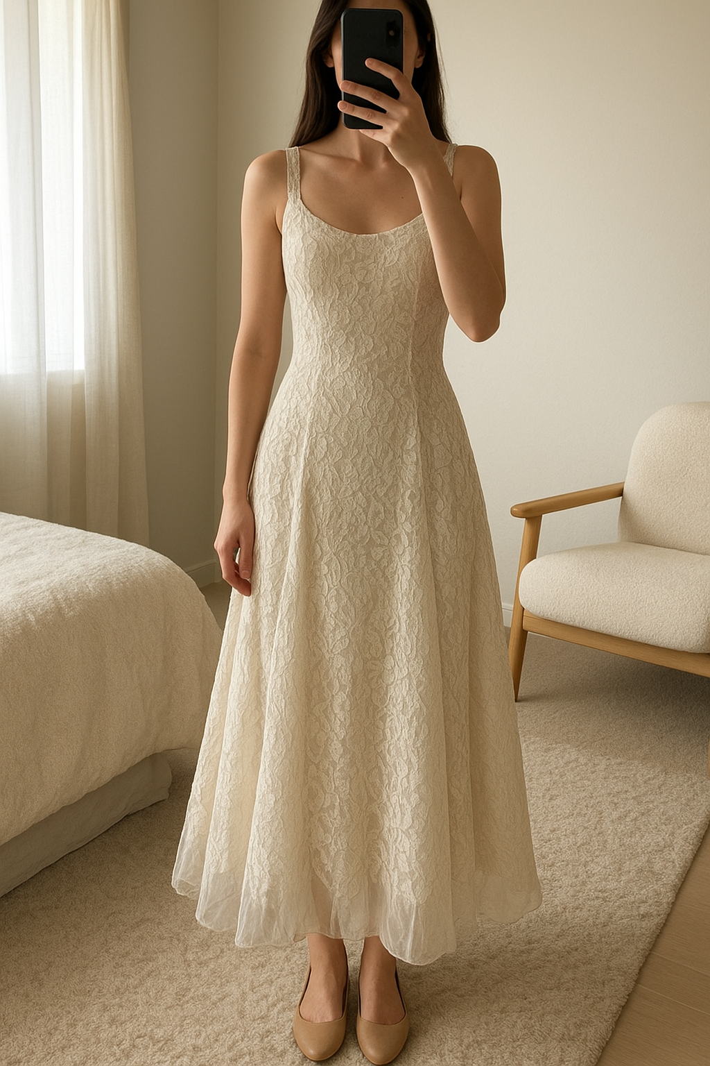 Beige lace flowy dress size 10 standing straight facing the camera, in a softly lit bedroom setting, with gentle natural light filtering through a window.