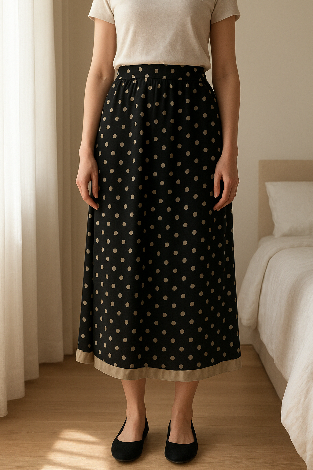belle jupe noire à pois crème en crèpe de soie T42 debout, face à la caméra, dans une chambre à la lumière douce, avec une lumière naturelle filtrant par la fenêtre.