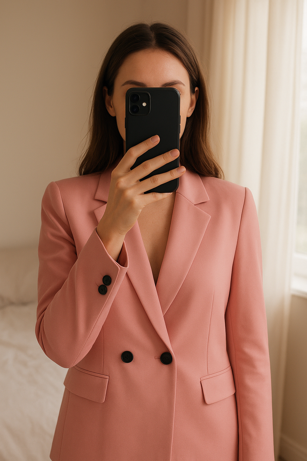 Bershka baby pink blazer standing straight facing the camera, in a softly lit bedroom setting, with gentle natural light filtering through a window.