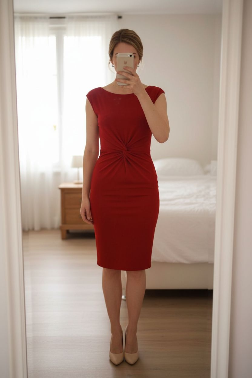BL Body Language Paris Abendkleid rot rückenfrei Stretch Gr. M neu aufrecht stehend, der Kamera zugewandt, in einem sanft beleuchteten Schlafzimmer, mit natürlichem Licht, das durch ein Fenster fällt.