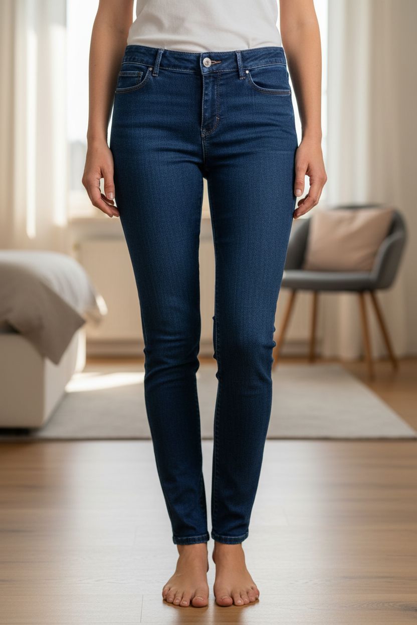 Blaue Slim Jeans Gr. 36 (6L) Stretch schmal geschnitten aufrecht stehend, der Kamera zugewandt, in einem sanft beleuchteten Schlafzimmer, mit natürlichem Licht, das durch ein Fenster fällt.