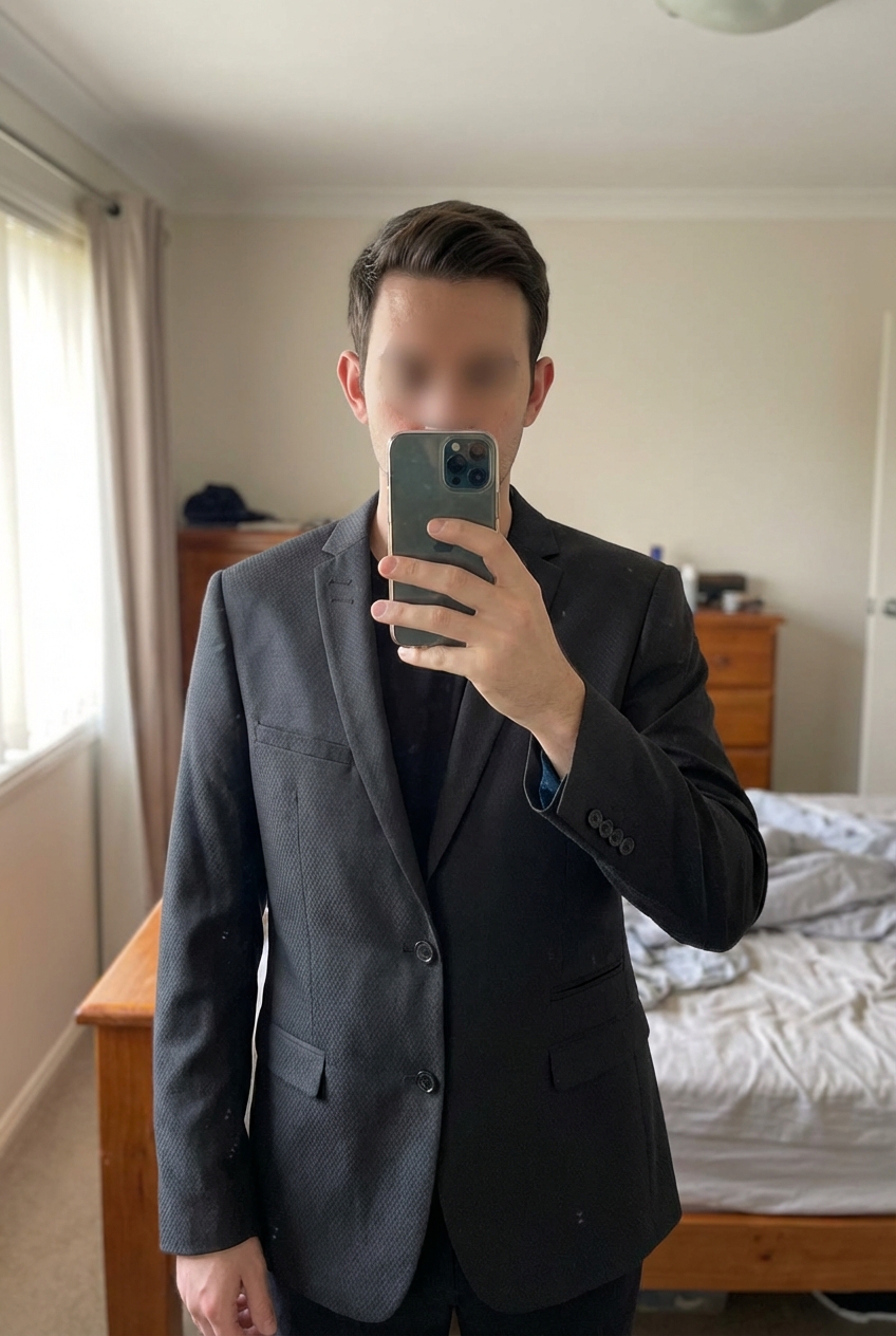 Blazer de costume Father & Sons – Bleu foncé debout, face à la caméra, dans une chambre à la lumière douce, avec une lumière naturelle filtrant par la fenêtre.