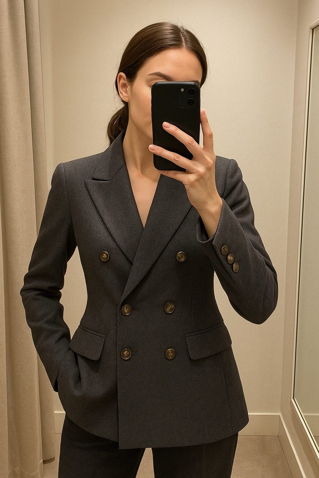 Une personne en Blazer femme Cerruti 1881 XXL cambrant légèrement le dos pour une pose dynamique, dans une cabine d’essayage de style boutique avec un miroir et une décoration neutre.
