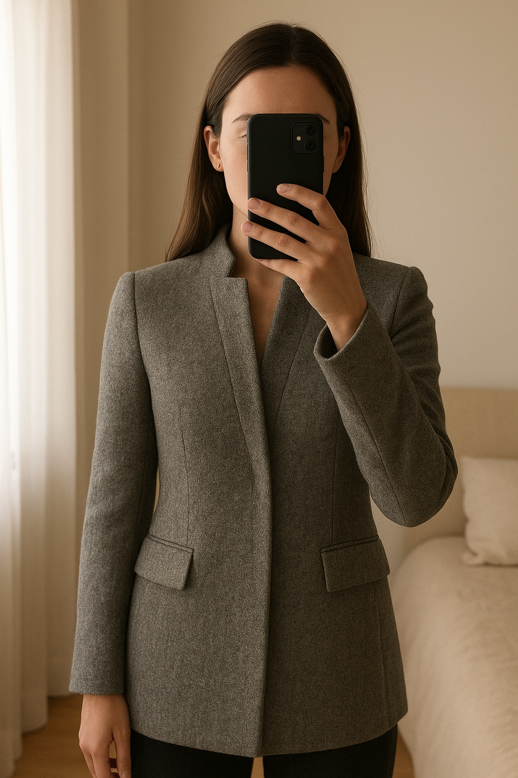 Blazer femme Zara gris chiné XS debout, face à la caméra, dans une chambre à la lumière douce, avec une lumière naturelle filtrant par la fenêtre.