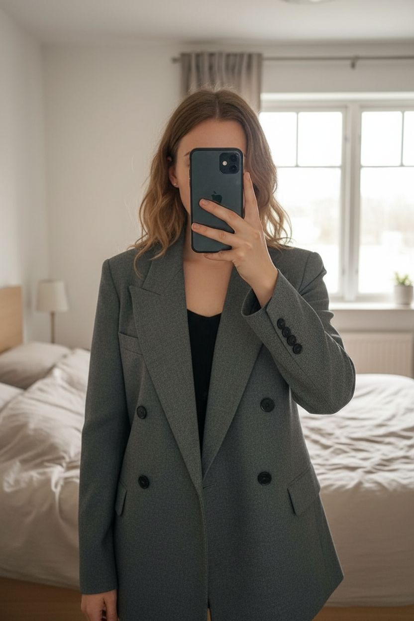 Blazer gris Berenice taille 34 debout, face à la caméra, dans une chambre à la lumière douce, avec une lumière naturelle filtrant par la fenêtre.