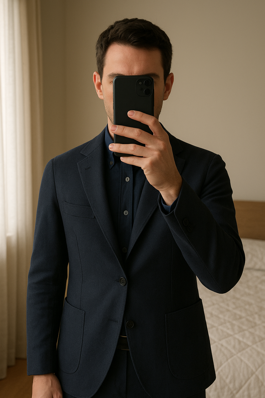 Blazer homme Devred slim extra debout, face à la caméra, dans une chambre à la lumière douce, avec une lumière naturelle filtrant par la fenêtre.