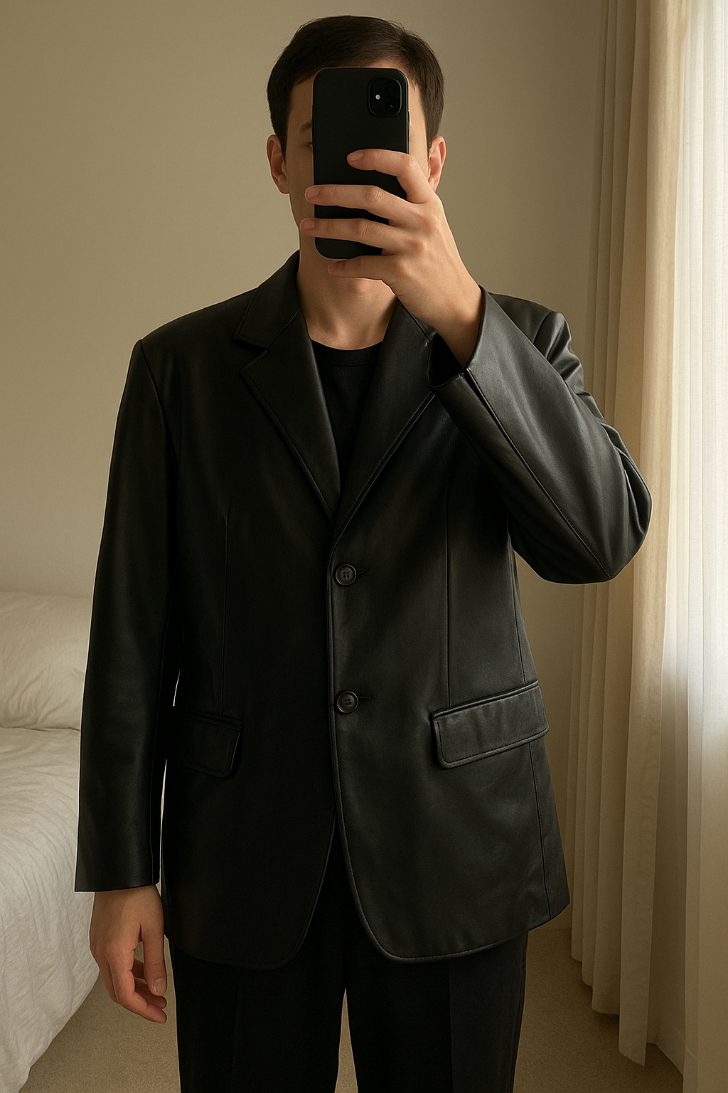 Blazer noir debout, face à la caméra, dans une chambre à la lumière douce, avec une lumière naturelle filtrant par la fenêtre.