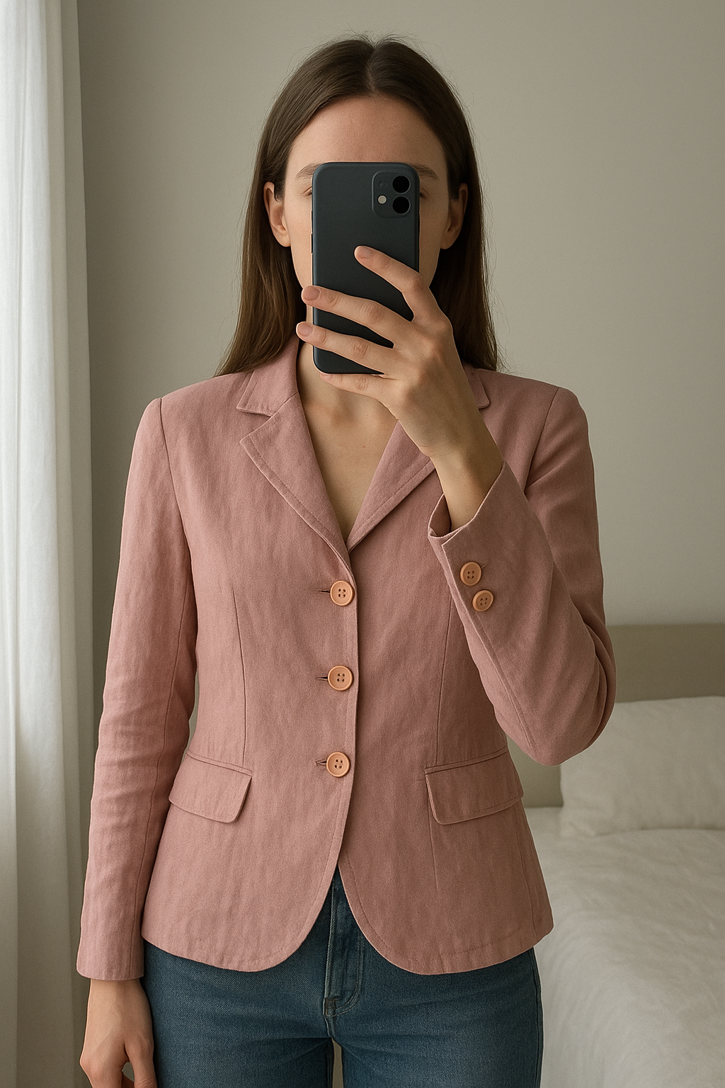Blazer rose pastel élégant et cintré pour femme – DINGEN, idéal pour le bureau et le printemps debout, face à la caméra, dans une chambre à la lumière douce, avec une lumière naturelle filtrant par la fenêtre.