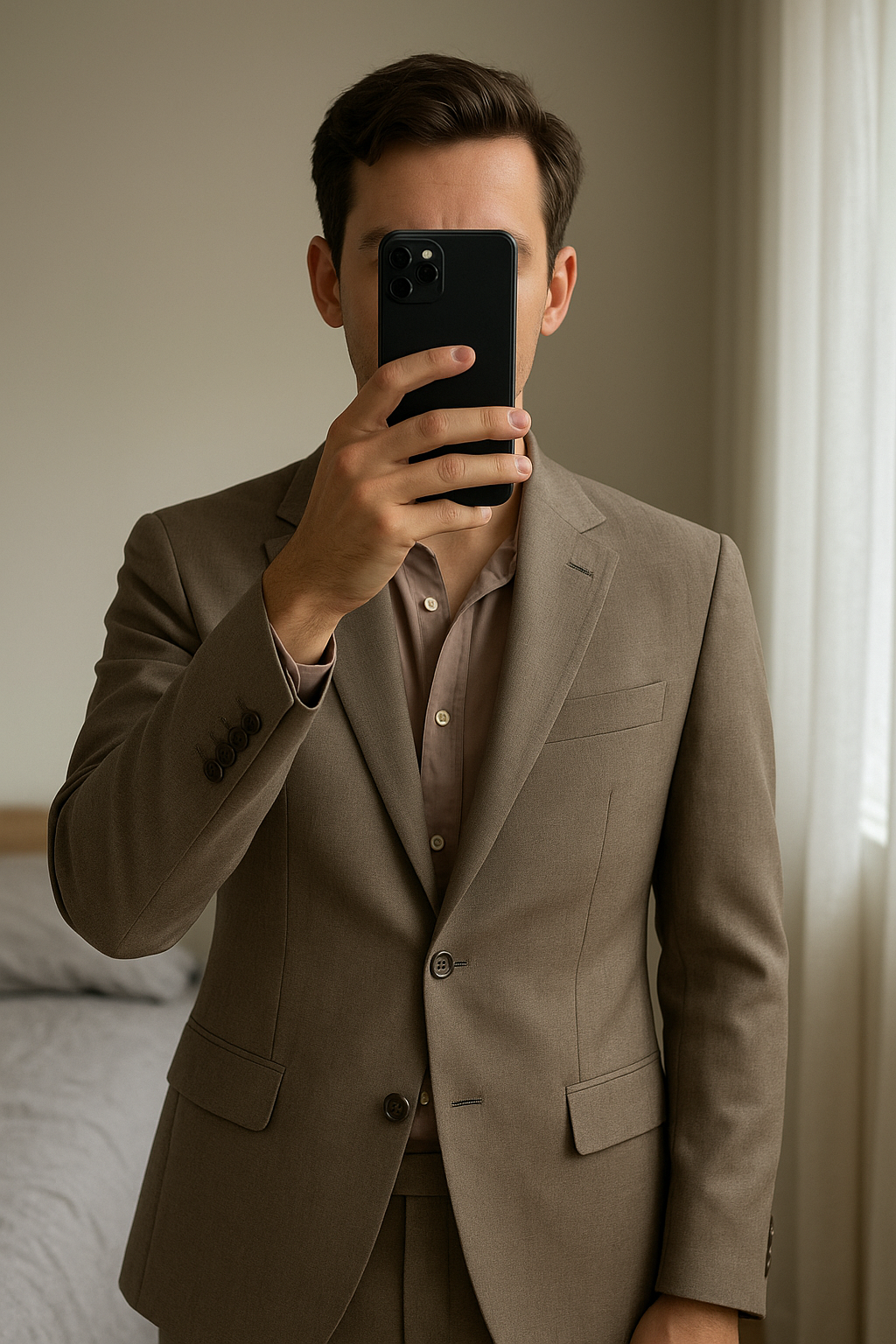 Blazer/veste de costume debout, face à la caméra, dans une chambre à la lumière douce, avec une lumière naturelle filtrant par la fenêtre.