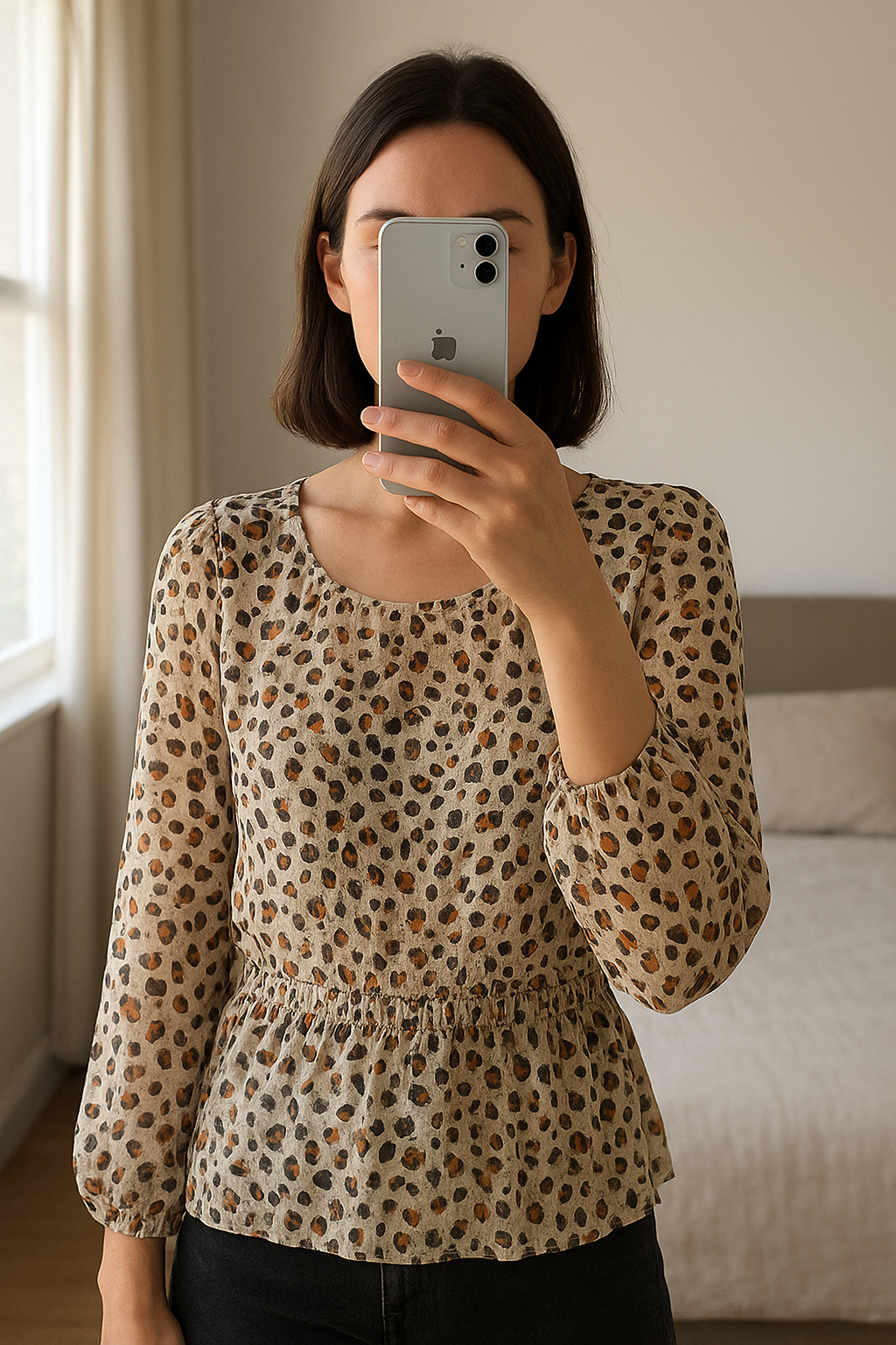 Blouse Bodyflirt T38 ttbe debout, face à la caméra, dans une chambre à la lumière douce, avec une lumière naturelle filtrant par la fenêtre.