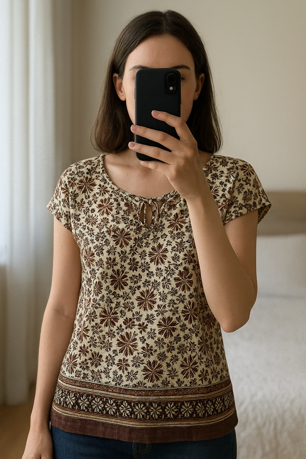 Blouse fleurie Camaïeu – T38/40 – Élégante & légère, imprimé bohème debout, face à la caméra, dans une chambre à la lumière douce, avec une lumière naturelle filtrant par la fenêtre.