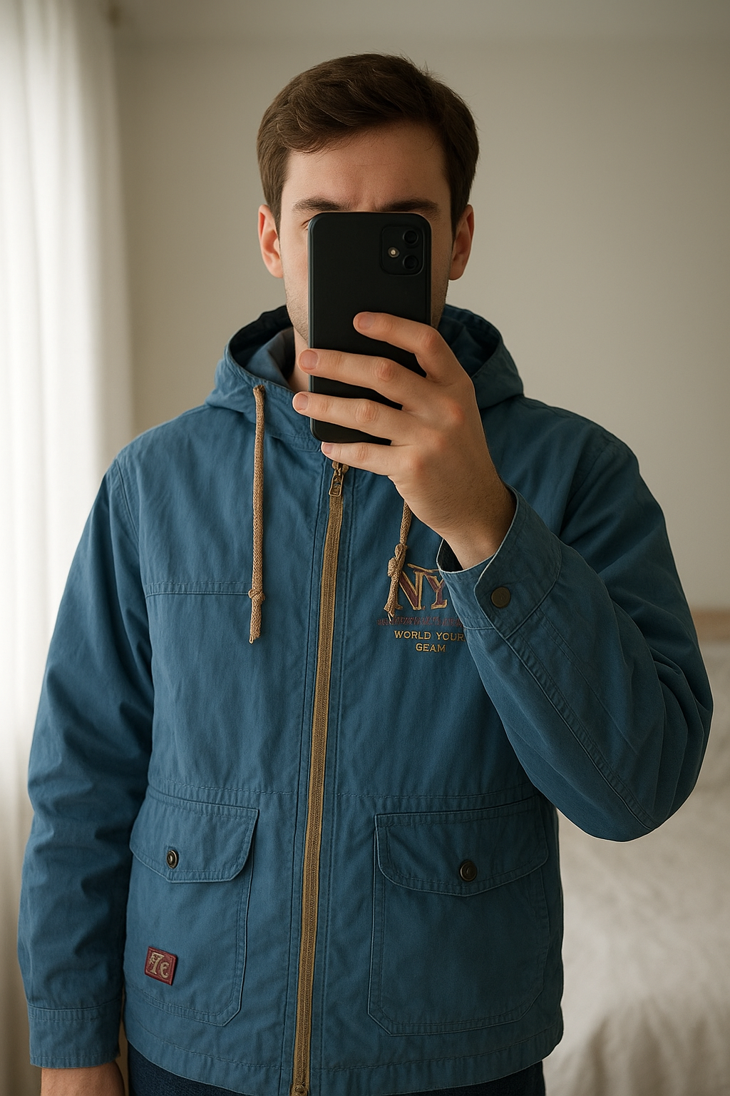 Blouson debout, face à la caméra, dans une chambre à la lumière douce, avec une lumière naturelle filtrant par la fenêtre.