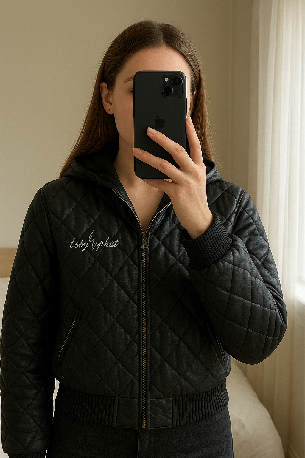 Blouson Babyphat debout, face à la caméra, dans une chambre à la lumière douce, avec une lumière naturelle filtrant par la fenêtre.
